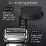 • INNOVATIVE 2IN1 SHAVING SYSTEM: Get a closer shave than ever before* with ultimate skin comfort thanks to Braun Series 9 PRO+ and the shave-preparing ProComfort head. *Tested vs. Series 9 PRO+ shave only