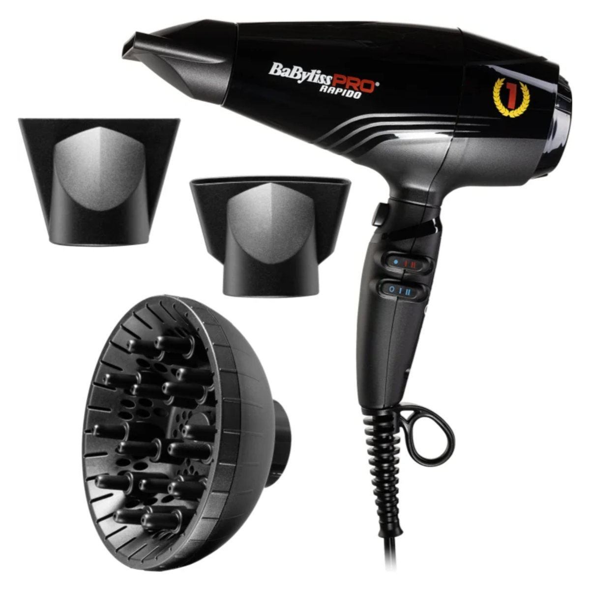 BaByliss Rapido black hair dryer is a high-performance professional hair dryer. It is incredibly powerful, light and has a particularly long lifespan. It is equipped with a cold air button and a Turbo function that enables fantastic hairstyles in a short time that last long and do not charge the hair statically. With a total of 22, 500 revolutions per minute, this hair dryer is a real high-performance hair dryer and is perfect for both professional and private use. It is also comfortable to handle and is easy on the joints, even with long hair or a long working day, and prevents tired, heavy arms. It’s a high-performance professional hair dryer. Its engine is developed by Ferrari with a service life of up to 5, 000 hours. Specification: airflow: 25.3 l/ sec, cable length: 2.80 m, 2200 watts. Pack includes 1 x straight, narrow centring nozzle; 1 x bevelled, wide centring nozzle; 1 x diffuser; 1 x noise-reducing filter against noise pollution.