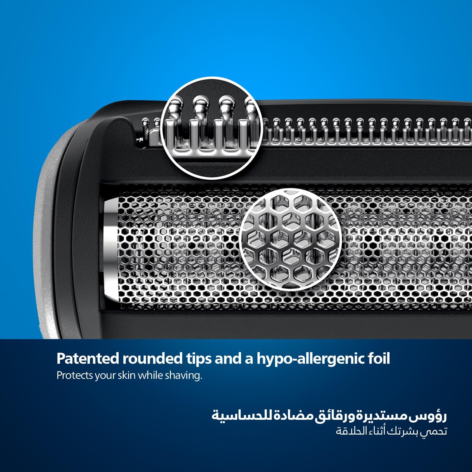 The shaver head features patented rounded tips and a hypo-allergenic foil to protect your skin while shaving. The bi-directional trimmers cut longer hairs, which are shaved by the foil for a closer result.